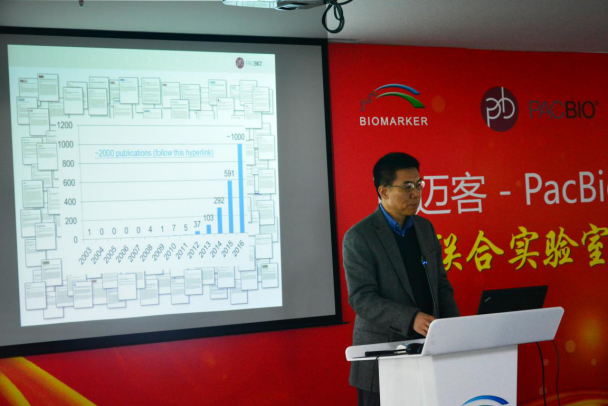 ? 接下來的學(xué)術(shù)交流環(huán)節(jié),PacBio公司亞太區(qū)市場部高級經(jīng)理錢祖衛(wèi)博士帶來了三代測序技術(shù)應(yīng)用的精彩分享,百邁客基因組高級技術(shù)總監(jiān)紀(jì)長綿分享了百邁客 公司與浙江大學(xué)借助三代測序等技術(shù)在Nature Genetics上發(fā)表的芥菜基因組文章,百邁客云市場部經(jīng)理孫瑛女士為大家介紹了百邁客云。儀式最后階段,基因組測序研發(fā)經(jīng)理楊帆帶領(lǐng)參會人員參觀了百 邁客的實驗室,講解了百邁客的發(fā)展歷程。