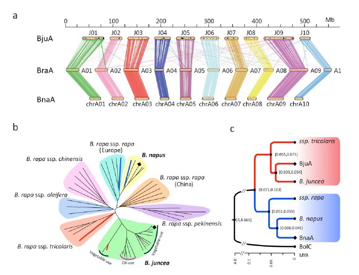 我們對10個(gè)菜用的芥菜、7個(gè)油用的芥菜,5個(gè)甘藍(lán)型油菜基因組、27個(gè)白菜基因組(多亞種)進(jìn)行了重測序分析,并繪制如上圖b中的進(jìn)化樹。從b圖中可以看到芥菜全部聚在一起,沒有出現(xiàn)分散的情況,說明芥菜中A的基因組是來源于同一個(gè)亞種,屬于單系起源。