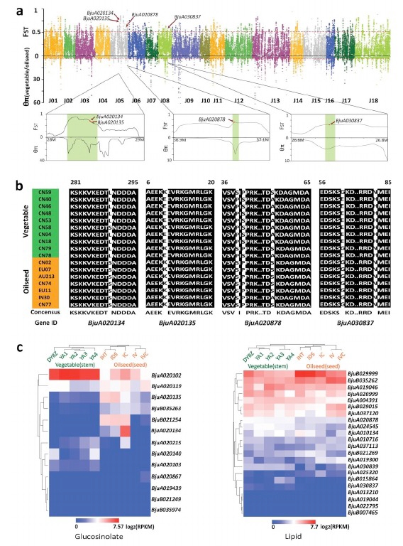 通過菜用和油用芥菜群體進(jìn)行選擇清除分析,發(fā)現(xiàn)dominance的基因被篩選出來的比例較高,同時(shí)結(jié)合轉(zhuǎn)錄組數(shù)據(jù),這部分基因在油用和菜用兩個(gè)群體中差 異表達(dá)。同時(shí)通過上面的分析發(fā)現(xiàn)與硫苷,脂類代謝顯著相關(guān)并且存在dominance的基因組,這些基因在油用菜用群體中有各自獨(dú)特基因分型。