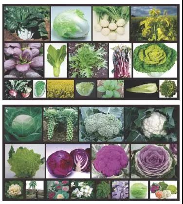 蕓薹屬包括三個二倍體物種:蕓薹(Brassica rapa)、黑芥(B. nigra)和甘藍(lán)(B. oleracea),這三個基本種經(jīng)過兩兩雜交又產(chǎn)生了四倍體的歐洲油菜(B. napus)、非洲油菜(B. carinata)和芥菜(B. juncea),這就是“禹氏三角”。隨著人工馴化和持續(xù)的育種工作,這些物種產(chǎn)生了高度多樣化的形態(tài)型,例如結(jié)成球狀的葉片、膨大的塊莖(或根部、頂芽、腋芽等)。有意思的是,某些物種的形態(tài)型,盡管是在不同的地區(qū)獨立培育而成,但卻表現(xiàn)出相似的表型特征,這便是趨同馴化的結(jié)果。