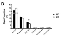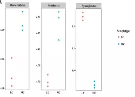 在細(xì)菌門水平,一共有14個原核的門被鑒定,主要是厚壁菌門(35.7-30.1%),擬桿菌門(26.6-43.6%)、互養(yǎng)菌門(11-7%),且通過門水平維恩圖分析發(fā)現(xiàn),在兩組(MC和LC)間門水平組成相同,比較分析兩組間微生物變化情況發(fā)現(xiàn)(如圖:FIG2),MC組相比于LC組,互養(yǎng)菌門增長了57%,無壁菌門增長了330%。而黏膠球形菌門降低了63%,纖維桿菌門降低了65%;