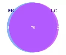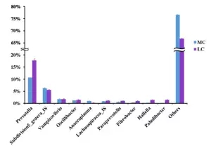 在細(xì)菌屬水平。共鑒定出75個屬水平細(xì)菌,在兩組間共有70個屬,在MC組有三個特有的屬,在LC水平有2個特有的屬,普氏菌屬(10.4-17.9%)在兩組間都為主要屬水平的菌。