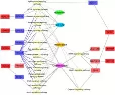在上皮細(xì)胞生長網(wǎng)絡(luò)中,基因GPR1,89和155的表達(dá)上調(diào)導(dǎo)致LAMTOR3蛋白,蛋白激酶和ELK1表達(dá)上調(diào),這三種蛋白都存在于MAPK信號通路上,和細(xì)胞的增殖分化有關(guān)。此外,GPR1的 表達(dá)增加和酸性酰胺酶(ASAH1)的下調(diào)相關(guān),ASAH1存在于調(diào)節(jié)細(xì)胞凋亡、生存和增殖的信號通路上。對于HDACs家族基因HDAC4,5,6和10基因的上調(diào)和五個調(diào)節(jié)細(xì)胞凋亡,生存和增殖基因的下調(diào)有關(guān)。