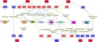 為了研究GPR和HDAC共表達(dá)網(wǎng)絡(luò)的生物學(xué)意義,改研究注釋了相關(guān)的信號通路和KEGG功能,發(fā)現(xiàn)顯著差異的鄰近基因被分類到瘤胃上皮細(xì)胞的生理調(diào)節(jié)過程,因此發(fā)現(xiàn)了兩類和上皮細(xì)胞生長調(diào)節(jié)有關(guān)系的功能網(wǎng)絡(luò),其中一類是上皮細(xì)胞生長網(wǎng)絡(luò)(包括細(xì)胞凋亡,增殖和分化,見下圖7),另外一類是上皮細(xì)胞的代謝網(wǎng)絡(luò)(包括輔酶因子和維生素代謝,能量代謝、氨基酸代謝等,見下圖8);