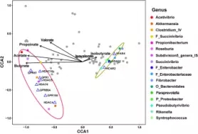 通過CCA相關(guān)性分析發(fā)現(xiàn),顯著上調(diào)的GPRs和HDACs與8個顯著增加的微生物屬(56個 OTUS)是呈正相關(guān),顯著下調(diào)的GPRs和HDACs和9個顯著減少的細(xì)菌屬呈正相關(guān)(63個OTU),然而HDAC1與丁酸鹽的比例呈負(fù)相關(guān)。