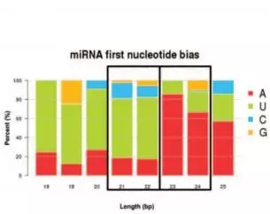 miRDeep2軟件鑒定175個(gè)潛在的miRNA。長度分布分析顯示21和22bp的miRNA豐度*高;對成熟miRNA的堿基偏好性分析:21和22bp的miRNA首位堿基偏好于“U”;23和24bp的miRNA首位堿基偏好于“A”。