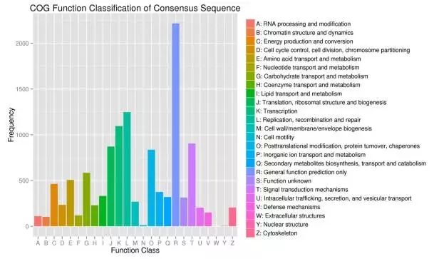 2.用BLASTX將組裝得到的序列與Nr,Swiss-Prot,GO,COG和KEGG數(shù)據(jù)庫進(jìn)行比對,共有8288個Unigenes注釋到了25個COG類別中的11713個功能。有585個Unigenes注釋到“碳水化合物的運輸和代謝”。