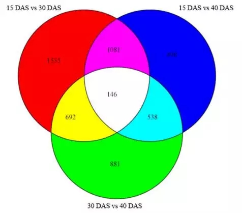 3.為了鑒定在洋蔥球莖膨脹過程中活躍的通路,將得到的unigenes與KEGG數(shù)據(jù)庫中標(biāo)準(zhǔn)參考通路進(jìn)行比對。15 DAS vs. 30 DAS注釋到了95個pathway,15 DAS vs. 40 DAS 注釋到了79個pathway,30 DAS vs. 40 DAS注釋到了86個pathway。共有6113個unigenes注釋到了120條KEGG通路中。“淀粉和蔗糖代謝”構(gòu)成了各樣本文庫中的初級代謝途徑,并有可能在球莖膨大和發(fā)育過程中活性更高。