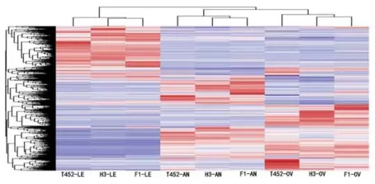 因?yàn)門452和H3的雜交F1代表現(xiàn)出了優(yōu)良性狀,因此可以通過轉(zhuǎn)錄組測序研究性狀差異的原因。取T452,H3及雜交F1代的三種不同組織分別進(jìn)行轉(zhuǎn)錄組測序,包括減數(shù)分裂階段的花藥、減數(shù)分裂階段的子房、開花階段的旗葉。總共測了548M clean reads,平均有89.06%的reads可以比對到參考基因組上,其中93.45%都是比對到唯一位置上。三個(gè)生物學(xué)重復(fù)之間的相關(guān)性都達(dá)到了0.8以上。用qRT-PCR的方法對12個(gè)差異表達(dá)基因(DEG)的表達(dá)量進(jìn)行了驗(yàn)證,結(jié)果與轉(zhuǎn)錄組測序的結(jié)果一致。對不同樣品進(jìn)行層次聚類分析表明,相同組織的樣品總能聚到一塊(圖2)。