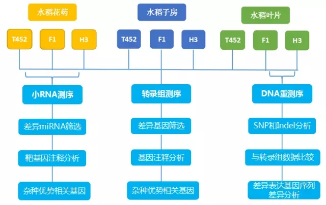 轉(zhuǎn)錄組測序:取T452,H3及雜交F1代的三種不同組織分別進(jìn)行轉(zhuǎn)錄組測序,包括減數(shù)分裂階段的花藥、減數(shù)分裂階段的子房、開花階段的旗葉。每個(gè)組織每種品系有3個(gè)生物學(xué)重復(fù),共27個(gè)樣品。測序平臺為Illumina HiSeq 2500,平均每個(gè)樣品測約5G。