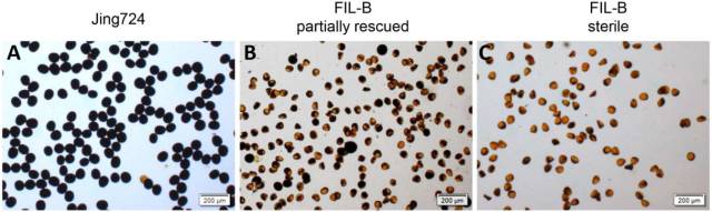 1、育性分析:FIL-B(育性不穩(wěn)定系)分為育性部分恢復(fù)的植株和完全不育植株,本項(xiàng)目所構(gòu)建的BC4群體462個(gè)子代中有14.9% 的植株為育性部分恢復(fù)的表型。育性部分恢復(fù)植株的花粉大小小于正常花粉,大于完全不育植株的花粉(Fig 1.)。經(jīng)I2-KI染色后的不育花粉表現(xiàn)出形態(tài)的不規(guī)則和染色的異常(Fig 2.)。