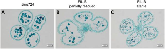 2、顯微鏡下觀察花粉小孢子:在育性部分恢復(fù)的植株中只有一部分的小孢子呈現(xiàn)在正常形態(tài),而在不育植株中無正常形態(tài)小孢子。(Fig 3.)