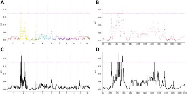 A: 各染色體上SNP的ED值; B: 2號(hào)染色體上SNP的ED值;C:各染色體上SNP經(jīng)擬合后的關(guān)聯(lián)分析結(jié)果;B: 2號(hào)染色體上SNP經(jīng)擬合后的的關(guān)聯(lián)分析結(jié)果,其中紅色的虛線代表閾值線(99百分位法計(jì)算得到),黑色的實(shí)線代表擬合曲線