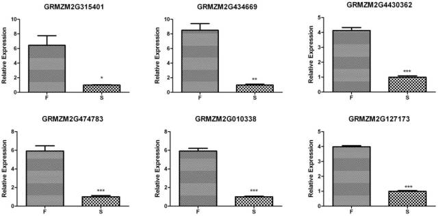 本研究選取6個(gè)與蛋白相關(guān)的候選基因,通過qPCR的方法驗(yàn)證RNA-seq結(jié)果。研究發(fā)現(xiàn)在育性部分恢復(fù)和不育兩種表型中,這6個(gè)候選基因出現(xiàn)4-8倍不同水平的差異表達(dá)。
