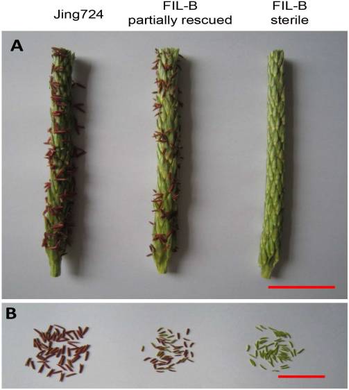 A:Jing724 和FIL-B (育性不穩(wěn)定系,包括育性部分恢復(fù)植株和完全不育植株) 在抽穗6天后的穗;B: A圖中各植株穗上的花粉. 其中紅色的標(biāo)尺代表 3 cm