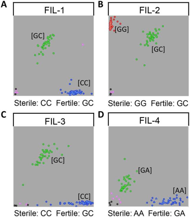 本研究選取BC4群體中50株育性部分恢復(fù)植株和50株不育植株,分別提取DNA,對候選的兩個(gè)蛋白基因共4個(gè)SNP位點(diǎn)進(jìn)行KASP驗(yàn)證,發(fā)現(xiàn)在不同的表型下會(huì)出現(xiàn)不同的基因型,再次暗示這兩個(gè)基因很可能是與育性不穩(wěn)定相關(guān)。