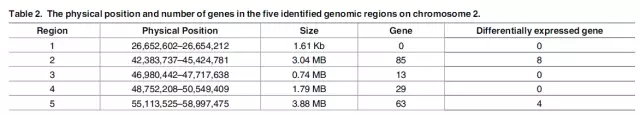 4、BSR關(guān)聯(lián)分析:與參考基因組比對后,F(xiàn)池和S池分別獲得171,594和 170,820個(gè) SNP,選取混池間差異的SNP位點(diǎn),進(jìn)行ED關(guān)聯(lián)分析,共得到5個(gè)候選區(qū)域(Fig 4.),結(jié)合數(shù)據(jù)庫注釋結(jié)果及轉(zhuǎn)錄組差異基因的結(jié)果,最終獲得12個(gè)候選基因(Table 2、Table 3)。