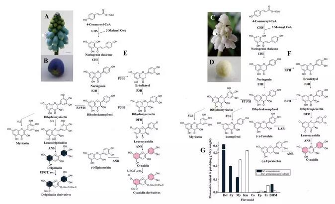 在藍色風信子中檢測到與Del合成相關的部分同源序列的表達上調,在某些情況下,高出> 1000倍。結合HPLC分析結果,DFR可能是白色葡萄風信子中藍色色素沉積(Del)消失的靶基因。另外,F(xiàn)LS和DFR在共同的二氫楊梅素底物之間的強烈競爭,可能部分地阻斷Del的合成并引起其他類黃酮化合物,如楊梅素的產生,由此進一步消除白色風信子中藍色色素沉積。