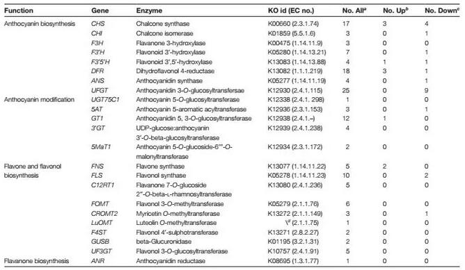 藍色和白色風信子分別建庫測序,分別得到2,031M和2,772M原始數據,原始數據經去冗余后組裝后得到89,926條uni-transcripts,平均長度為633bp。通過KEGG通路注釋,共有143個uni-transcripts注釋到色素相關的三個代謝通路,類黃酮生物合成,花青素生物合成,黃酮和黃酮醇生物合成途徑。