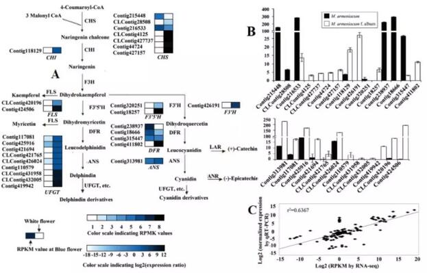 通過將藍色和白色風信子花青素顏色代謝相關關鍵基因比較分析,顯示出了與一般研究相反的結果,即在白色風信子花中,大部分花青素合成相關的uni-transcripts表達豐度高于在藍色花中的表達。進一步研究發(fā)現(xiàn),在白色花瓣提取物中檢測到大量的類黃酮化合物,其中許多與花青素共享相同的中間體或酶。這可能是花青素含量與葡萄風信子花色苷生物合成基因表達量不相關的主要原因。最后,選擇花色相關基因qRT-PCR驗證,驗證測序結果的準確性。