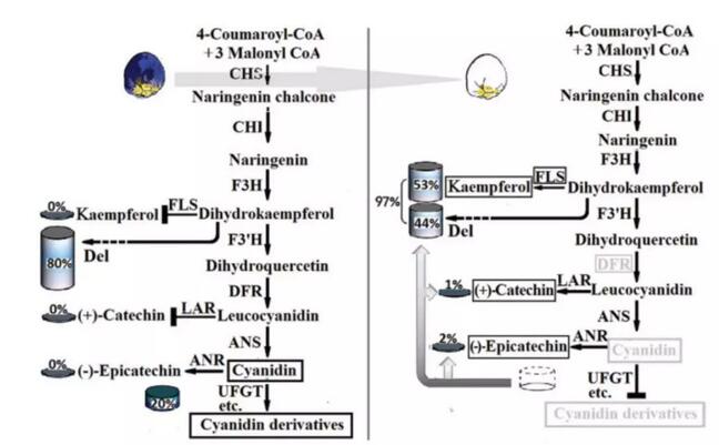 白色風信子花瓣中兒茶素(catechin )和表兒茶素(epicatechin )的存在,表明紅色Cy一定存在于白色花中,即使只是很短的時間或很少的量,暗示著Cy色素丟失的復雜代謝機制。Cy合成上游反應中的通路的受阻以及下游反應中的多重分支變化過程,最終導致白花紅色色素的消失。