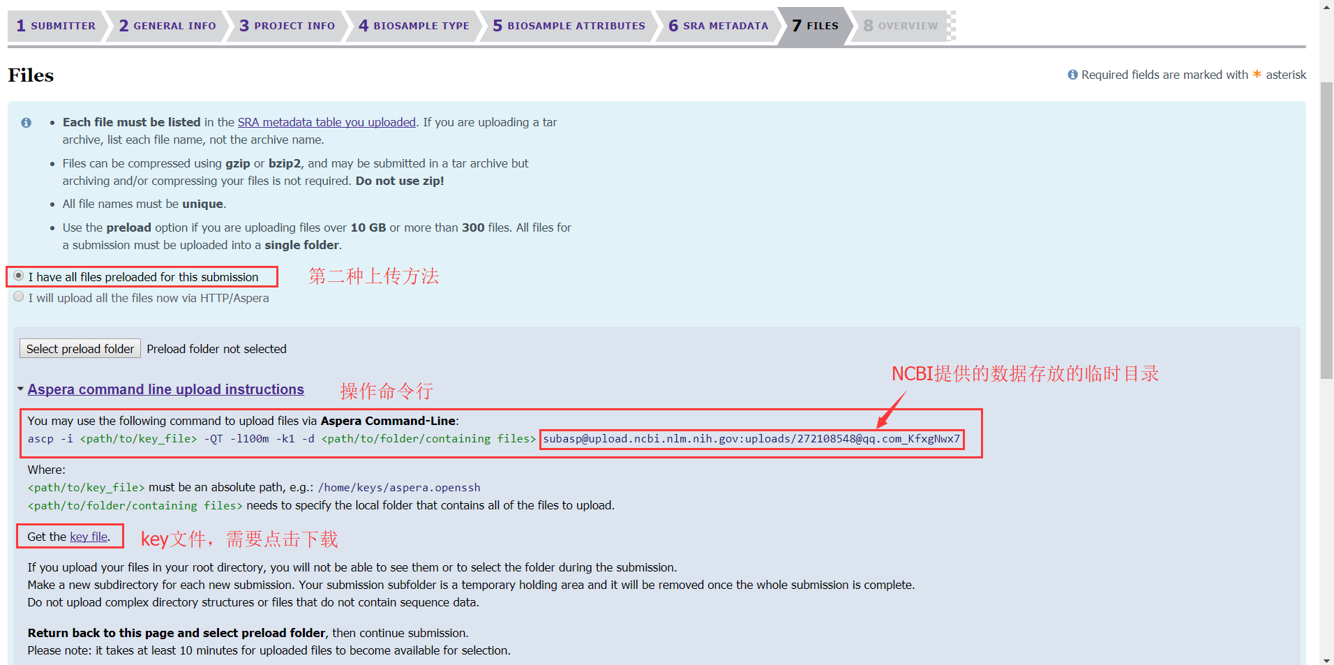 第八步:重點來了,這一步是將我們的數(shù)據(jù)傳到NCBI的服務(wù)器上,需要下載安裝一個軟件Aspera(http://downloads.asperasoft.com/connect2/,windows下也可以安裝)。軟件安裝完成后有兩種上傳方法:(1)可以直接上傳,適用于數(shù)據(jù)量小、樣本量小的項目;