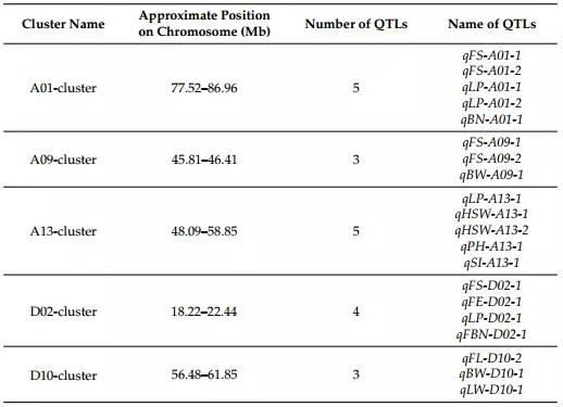 作者以10 Mb(?20 cM)物理區(qū)域包含兩個或多個QTL定為QTL簇標準。在5條染色體上檢測到5個QTL簇,每個簇至少有3個QTL(表1)。其中3個位于A基因組,2個位于D基因組中。鑒定出含有影響纖維品質和產量性狀的多個QTL的基因組區(qū)域,有利于后期分子改良。
