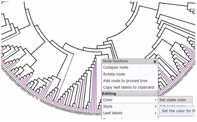 4、分枝顏色的統(tǒng)一。上面的著色例子只對末端分枝進(jìn)行了著色,有時候,我們需要對某個分枝的樣本進(jìn)行顏色的統(tǒng)一,可以選中該分枝并點(diǎn)擊鼠標(biāo),在彈出的下拉框中選擇color — set clade color — 選擇想用的顏色或填入對應(yīng)的顏色代碼即可。