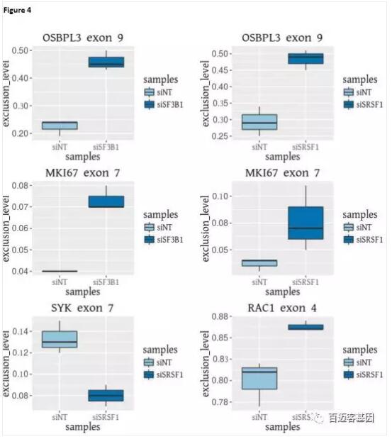為了進(jìn)一步驗證,作者選擇了4個外顯子跳躍事件進(jìn)行RT-qPCR驗證,包括SYK exon 7, RAC1 exon 4, OSBPL3 exon 9, MKI67 exon 7(如圖4所示)。根據(jù)RNA-seq分析,所有的事件在SRSF1下調(diào)后都發(fā)生了差異剪接,而OSBPL3和MKI67則受SF3B1下調(diào)的影響。