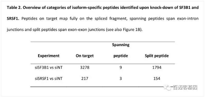 在siSF3B1和siSRSF1的差異剪接結(jié)果中,分別確定了5079和374個isoform特異肽段(如表1所示)。