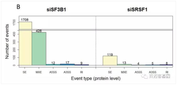 轉(zhuǎn)錄組分析顯示siSF3B1和siSRSF1的可變剪接事件與對照組相比有顯著差異(圖3A),證明對剪接因子的操作導(dǎo)致了差異剪接的產(chǎn)生。