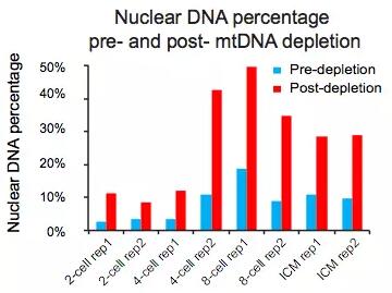 ATAC測序和轉(zhuǎn)錄組一樣,也是有時空特異性,但是由于ATAC測序建庫的時候需要對細(xì)胞進行裂解提取細(xì)胞核,再通過轉(zhuǎn)座酶對細(xì)胞核中正在轉(zhuǎn)錄組的染色體序列進行酶切,那么我們對實驗處理中的細(xì)胞活性就有一定的要求—不能用凍存后的細(xì)胞來建庫;另外,由于轉(zhuǎn)座酶對DNA序列進行酶切的時候,只要是轉(zhuǎn)座酶可以接近的區(qū)域都可以進行酶切,這就造成了測序數(shù)據(jù)中有好大一部分是線粒體的DNA序列,這些DNA我們認(rèn)為是污染的部分,會盡量用探針進行除去,但是探針去除的效率也有限。如在小鼠胚胎不同發(fā)育時期的ATAC測序?qū)嶒炛?,作者對探針去除線粒體DNA的效率進行了鑒定[2],所測結(jié)果如圖1,可見核DNA最多的時候占比也僅僅有50%,那么相比較而言線粒體DNA的去除也就相當(dāng)重要了;而植物細(xì)胞,由于其細(xì)胞壁結(jié)構(gòu)不能直接通過酶對細(xì)胞進行裂解,并且測序結(jié)果中有好大一部分是葉綠體DNA污染,因此在做植物的ATAC測序時,則需要將植物細(xì)胞制備成原生質(zhì)體,并且用梯度離心法來收集細(xì)胞核后再進行建庫[5]。不管是線粒體DNA還是葉綠體DNA的污染,都可以在建庫之后進行少量數(shù)據(jù)測序,通過簡單的比對分析,來大概估測文庫中的污染占比,從而決定是否正式進行測序。