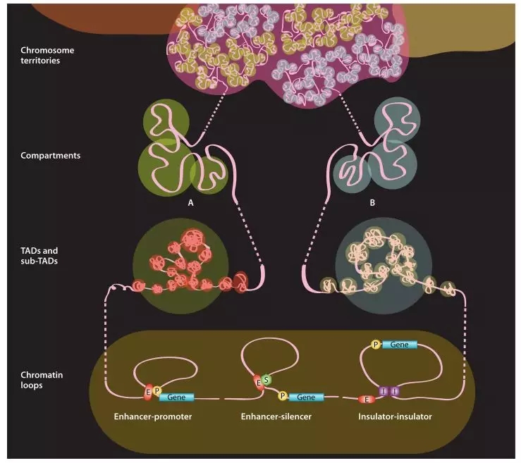 DNA在染色體上是高度折疊的,DNA與DNA片段之間不可避免的形成了高強度的交互作用。2002年提出的3C技術(shù),用于測定染色體特定位點與位點之間的交互作用,隨后發(fā)展出4C、5C 技術(shù),分別用于測定染色體上一點到多點和多點與多點之間的交互作用。Job Dekker在2009年開發(fā)出Hi-C 技術(shù),實現(xiàn)了全基因組范圍內(nèi)染色體片段間相互作用的捕獲。Hi-C 除了用于輔助基因組組裝、對已組裝的基因組進行糾錯,還可以揭示基因組的三維結(jié)構(gòu)特征,包括從隔室(A/B Compartments)到拓撲相關(guān)結(jié)構(gòu)域(TAD),最后到染色體環(huán)(loop),目前,已在人、果蠅、酵母、擬南芥、水稻和棉花等物種成功構(gòu)建基因組三維結(jié)構(gòu),并完成了對不同樣本基因組三維結(jié)構(gòu)的比較分析。