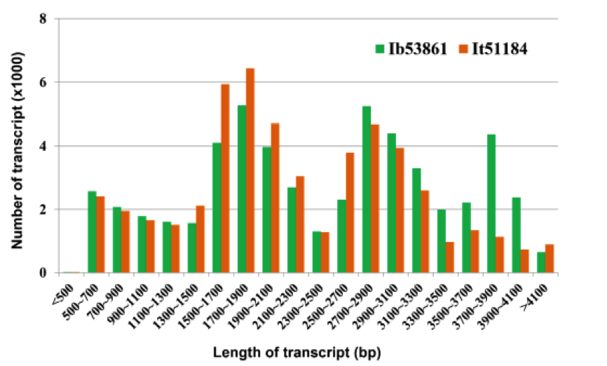 圖3. 在甘薯(Ib53861)和野生甘薯(It51184)中的53,861個非冗余轉錄物的數量和長度分布。
