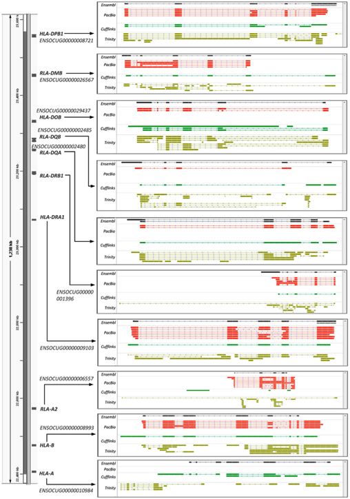 Figure 4.基因通過PacBio所測轉錄本和組裝得到的轉錄本還原10個MHC基因。染色體定位、命名和每個基因的Ensembl編號(在左側)
