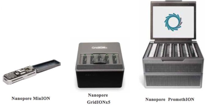 Oxford公司的Nanopore測(cè)序技術(shù)借助單個(gè)分子通過納米孔時(shí)引起孔兩側(cè)電位差來實(shí)現(xiàn)信號(hào)檢測(cè),納米孔的直徑僅允許單個(gè)核苷酸聚合物通過,而ATCG四種堿基的帶電性質(zhì)不同,因此通過電信號(hào)差異特征即可檢測(cè)出通過納米孔的堿基類型,從而實(shí)現(xiàn)測(cè)序,目前主要測(cè)序平臺(tái)為Nanopore MinION、Nanopore GridIONx5、 Nanopore PromethION。