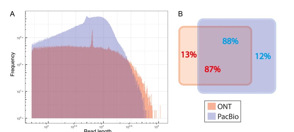 相比于 PacBio,MinIon 能產(chǎn)出更長(zhǎng)的序列,但是 PacBio 測(cè)到的序列數(shù)量是 MinIon 的 5.6 倍左右。大部分的序列在兩個(gè)平臺(tái)都能檢測(cè)到,個(gè)別特有的序列可能和實(shí)驗(yàn)階段的片段篩選有關(guān)。