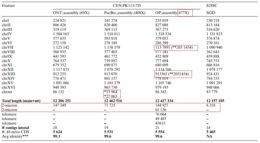 對(duì)于不同測(cè)序平臺(tái)得到的基因組數(shù)據(jù),采用 3 種組裝方式:只用 MinIon 得到的數(shù)據(jù)進(jìn)行 de nove組裝得到 ONT_assembly;只用 PacBio 得到的數(shù)據(jù)進(jìn)行 組裝得到 PacBio_assembly;用 MinIon和 PacBio 得到的數(shù)據(jù)共同進(jìn)行 de nove 組裝得到 OP_assembly。然后使用 Illumina 的數(shù)據(jù)對(duì)組裝結(jié) 果進(jìn)行校正。三種組裝方式得到的 2μm 質(zhì)粒都比已知的 S288C 酵母的 2μm 質(zhì)粒更長(zhǎng),而ONT_assembly 的組裝結(jié)果很好,剛好組裝出 16 條染色體,1個(gè)線粒體序列,1個(gè)質(zhì)粒序列;PacBio_assembly 組裝的線粒體序列是斷裂開的兩段;OP_assembly 組裝出的 contigs 最多,多出 3個(gè)端粒 DNA 片段,2 個(gè)質(zhì)粒片段,而且組裝時(shí)把 VII 染色體和 XIII 染色體的端粒區(qū)域連接在了一 起。 總體來(lái)看,三種組裝方式得到的基因組很相近,由于 OP_assembly 的測(cè)序深度最高,與 S288C酵母的平均比對(duì)率達(dá)到了 99.6%。
