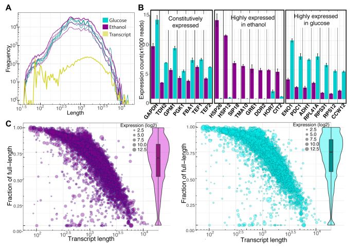 分別對(duì)葡萄糖條件和乙醇條件下生長(zhǎng)的酵母進(jìn)行全長(zhǎng)轉(zhuǎn)錄組測(cè)序,葡萄糖生長(zhǎng)條件下的酵母 共計(jì)獲得~509 MB(59X)數(shù)據(jù)量,包含約 530,000 高質(zhì)量 reads,其中 N50 為 1150bp;乙醇條 件下的酵母共計(jì)獲得~623 MB(72X)數(shù)據(jù),約 623000 高質(zhì)量 reads,其中 N50 為 1263 bp。該 技術(shù)的比對(duì)率為 88%,錯(cuò)誤率為 12%,其中超過(guò) 70%的轉(zhuǎn)錄本為全長(zhǎng)轉(zhuǎn)錄本,鑒定長(zhǎng)度最長(zhǎng)轉(zhuǎn)錄 本超過(guò) 5kb。全長(zhǎng)轉(zhuǎn)錄本的比例隨著轉(zhuǎn)錄本長(zhǎng)度增加而減小,與轉(zhuǎn)錄本的表達(dá)量沒(méi)有明顯關(guān)系。有22 個(gè)轉(zhuǎn)錄本是明顯高表達(dá)的,比如 豐度最高的轉(zhuǎn)錄本之一, 的同源 基因,在兩個(gè)培養(yǎng)條件下表達(dá)量都很高;在乙醇條件下特異高表達(dá)一些與熱休克蛋白、氧化脅迫 相關(guān)的基因,其中 編碼檸檬酸合酶,說(shuō)明此時(shí)激活了乙醛酸途徑;在葡萄糖培養(yǎng)條件下,與 有氧呼吸、核糖體相關(guān)的基因表達(dá)量較高,符合此條件下酵母生長(zhǎng)更快的特征。