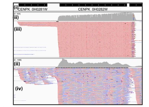 MinION 的數(shù)據(jù)中,我們發(fā)現(xiàn)相鄰的 2 個(gè)基因 PTH1 (CENPK0H0281W) 和 ERG9 (CENPK0H0282W) 轉(zhuǎn)錄在一個(gè)轉(zhuǎn)錄本中,有大量的 reads 跨越了基因間區(qū)。而 Illumina 的比對(duì)結(jié)果中, 在兩個(gè) ORFs 之間的區(qū)域,比對(duì)到的 reads 不是完全覆蓋的,這種低置信度的信息很可能被忽略。