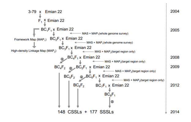 著絲粒區(qū)域鑒定:blastn,SPSS software (version 17.0)?;基因組共線性分析:MUMmer (version 3.23),GATK(version 3.1.1),Samtools(version 0.1.19)?,MCScanX package;結(jié)構(gòu)變異檢測:MUMmer3 (version 3.23);二倍體棉重測序SNPs鑒定:Trimmomatic (version 0.32),BWA;168個CSSLs群體SNPs鑒定:染色體片段置換系(CSSLs)的構(gòu)建(圖1),測序深度(6X),插入片段:350 bp,BWA,GATK和Samtools;CSSLs群體QTLs定位與表達分析:QTL IciMapping (version 4.0)?;TopHat2 (version 2.0.13)?;Cufflinks (version 2.2.1);STRUCTURE (version 2.3)?;TASSEL software (version 5.0)?;
