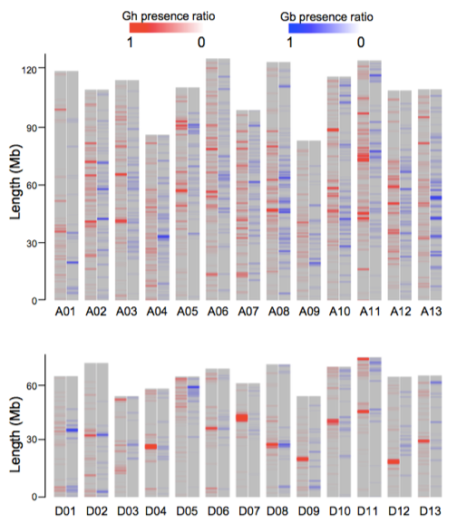 棉花是世界上*大的天然紡織纖維來源,每年纖維產(chǎn)量的90%以上來自異源四倍體棉花(G. hirsutum和G. barbadense),它起源于大約1-2百萬年前的異源多樣化事件,隨后是數(shù)千年的不對稱亞基因組選擇。陸地棉(G. hirsutum)由于其高產(chǎn)而在全世界種植。G. barbadense以其卓越的纖維質(zhì)量而受贊譽。為了培育產(chǎn)生纖維更長,更細和更強韌的陸地棉(G. hirsutum)品種,一種合理有效的方法是將海島棉(G. barbadense)的優(yōu)良纖維性狀引入陸地棉?;蚪M學啟動的育種策略需要對基因組組織進行詳細而有力的理解。
