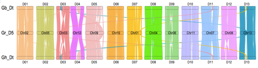 四倍體陸地棉和海島棉基因組的組裝使得研究人員能夠進一步探索四倍體棉亞基因組和其二倍體祖先之間的基因組差異。首先通過對具有D型基因組的13份二倍體材料進行重測序分析,分析顯示在兩種四倍體棉D-亞基因組具有相同的二倍體祖先種雷蒙德氏棉G. raimondii(D5 genome,D亞基因組供體);進而利用二倍體雷蒙德氏棉G. raimondii直接進行基因組比較分析,發(fā)現(xiàn)四倍體陸地棉和海島棉與雷蒙德氏棉相比,都有一些獨特的結(jié)構(gòu)變異,如在海島棉染色體D05和陸地棉D12中均存在大的染色體臂間倒位,暗示這些變異出現(xiàn)在多倍化之后(圖5)。研究人員還觀察到兩個四倍體相對于G. raimondii共有一些結(jié)構(gòu)變異,例如染色體D09中兩個四倍體發(fā)生了大的反轉(zhuǎn)(圖5)。研究中同時運用了二倍體祖先種亞洲棉G. arboreum(A2 genome,A亞基因組供體)的Hi-C數(shù)據(jù),與陸地棉和海島棉A亞基因組進行比對,檢測棉由二倍體到四倍體多倍化過程中發(fā)生的結(jié)構(gòu)變異,Hi-C具體矩陣圖顯示在13條染色體中發(fā)生了大規(guī)模的染色體重排,其中發(fā)部分變異為兩個四倍體的棉的A亞基因組共有。研究中發(fā)現(xiàn)染色體A06中*大的染色體臂間倒位(in2)在陸地棉中是特有的(圖3?左),表明這種結(jié)構(gòu)變異可能在染色體多倍化后發(fā)生。因此得出結(jié)論,二倍體棉花中的A基因組在異源多倍化后被重組,導致不同四倍體(陸地棉和海島棉)中發(fā)生了大染色體倒位。