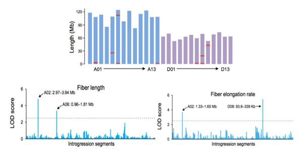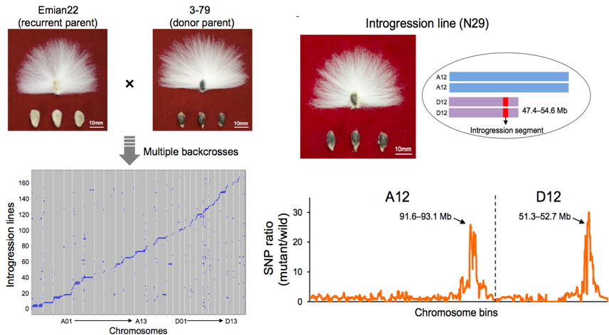 通過研究發(fā)現(xiàn)了在陸地棉(G.?hirsutum?acc. TM-1)和海島棉(G. barbadense?acc. 3-79)間存在廣泛的遺傳變異,進一步推測這些變異的一部分可能是造成表型差異的原因,包括纖維性狀。為了利用這些變異進行定向育種,研究人員構(gòu)建了一個漸滲系群體,旨在引入有利的變異,控制從G.barbadense到G. hirsutum等重要農(nóng)藝性狀的形成,如纖維質(zhì)量。研究人員通過分子標記對168份漸滲系材料進行測序,并鑒定了涵蓋所有26條染色體的466個基因滲入片段(圖6)。研究人員發(fā)現(xiàn)了在染色體D12中含有漸滲片段的漸滲系,其具有有限的絨毛纖維,類似于其供體親本G.barbadense?3-79(圖6,圖7上),基因滲入片段的位置與無絨天然突變體G. hirsutum?Xuzhou142fl的圖譜測序所示的位置相同,然而其遺傳基礎以前未被充分了解(圖7下)。這些結(jié)果表明,陸地棉(G. hirsutum)中無絨毛突變體的遺傳變異與海島棉(G. barbadense)中的數(shù)量性狀基因座(QTL)共定位。該漸滲片段與天然纖維突變體的特征將有助于比較分析海島棉和陸地棉之間的絨毛纖維起始機制。
