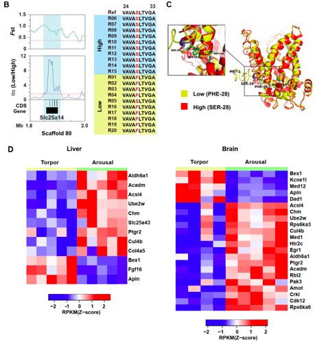 為了更好地了解喜馬拉雅旱獺的高原適應(yīng)性機(jī)制,研究人員從極高海拔(海拔> 4,500 m,n = 10)和相對(duì)低海拔(<1,900 m,n = 10)收集了20只喜馬拉雅旱獺。研究人員首先測(cè)量了血液參數(shù),發(fā)現(xiàn)與低海拔喜馬拉雅旱獺相比,高海拔喜馬拉雅旱獺的一些血液相關(guān)性狀,尤其是紅細(xì)胞計(jì)數(shù),血紅蛋白濃度和平均紅細(xì)胞體積顯著增加。接下來(lái),對(duì)每個(gè)喜馬拉雅旱獺進(jìn)行了全基因組測(cè)序,并在喜馬拉雅旱獺基因組中搜索了具有高種群分化(Fst)和多樣性比率(qp,low/qp, high)的區(qū)域,最終鑒定了分布在喜馬拉雅土撥鼠基因組不同scaffolds?中的24.84 Mb受選擇的區(qū)域。這些區(qū)域含有383個(gè)功能基因,與非選擇性基因相比,這些基因具有更高的Ka / Ks值(P <0.01),主要功能類別包括“缺氧反應(yīng)”,“DNA修復(fù)”,“血管生成”,“心臟功能”,“脂肪酸代謝”,“細(xì)胞周期”,“發(fā)熱”和“鈣信號(hào)通路”。參與缺氧誘導(dǎo)因子-1(HIF-1),血管內(nèi)皮生長(zhǎng)因子(VEGF)或其它缺氧相關(guān)信號(hào)通路的10個(gè)功能基因,包括Slc25a14,Nox-1,Hmox1,Vegfr2,Atg16l2,Bex1,Ptgr2,Gprasp1,F(xiàn)am46d?和Chd3,在高海拔和低海拔群體之間顯示出明顯的基因分型差異(圖4 A)。在Slc25a14中發(fā)現(xiàn)了非同義替換(由Ser28取代Phe28,F(xiàn)28S),其顯示出*強(qiáng)的分化信號(hào)(FST = 0.73)(圖4 A和B)?;谕唇5腟lc25a14的三維結(jié)構(gòu)顯示,F(xiàn)28S替換發(fā)生在N末端的loop區(qū)域,并且由于氨基的電荷和極性的變化而增加其與相鄰的α-螺旋的距離(圖4 C)。為了進(jìn)一步評(píng)估這一變體的功能影響,研究人員將突變體Slc25a14與其在不同哺乳動(dòng)物中的直系同源基因進(jìn)行比對(duì),并發(fā)現(xiàn)Phe28在比對(duì)的其它動(dòng)物中高度保守。該突變體功能影響的預(yù)測(cè)證明F28S取代是有害的,所有這些結(jié)果都表明F28S突變可能是高海拔群體Slc25a14選擇性清除的結(jié)果。為了推測(cè)旱獺高海拔適應(yīng)和冬眠的遺傳適應(yīng)性機(jī)制,研究人員在選擇性清除區(qū)域鑒定到了116個(gè)差異表達(dá)基因,在這些基因中,25個(gè)差異表達(dá)基因與HIF-1途徑相關(guān),主要屬于DNA修復(fù),血管生成,脂肪酸代謝,細(xì)胞凋亡/細(xì)胞周期和發(fā)熱的類別相關(guān)。在冬眠/覺(jué)醒周期中,大量選擇性清除基因具有差異表達(dá),表明這兩種生物學(xué)過(guò)程之間存在共同的遺傳影響(圖4 D)。在這些基因中,Bex1, Apln, kcne1l, Med12, Dad1和Fgf16在冬眠階段肝臟或腦中顯著上調(diào)(圖4 D),進(jìn)一步證明這些基因參與冬眠和高原適應(yīng)性,先前的研究報(bào)道了這些基因參與許多生理過(guò)程,包括神經(jīng)元分化,肝再生,血管生成和能量代謝,而這需要進(jìn)一步的實(shí)驗(yàn)驗(yàn)證。