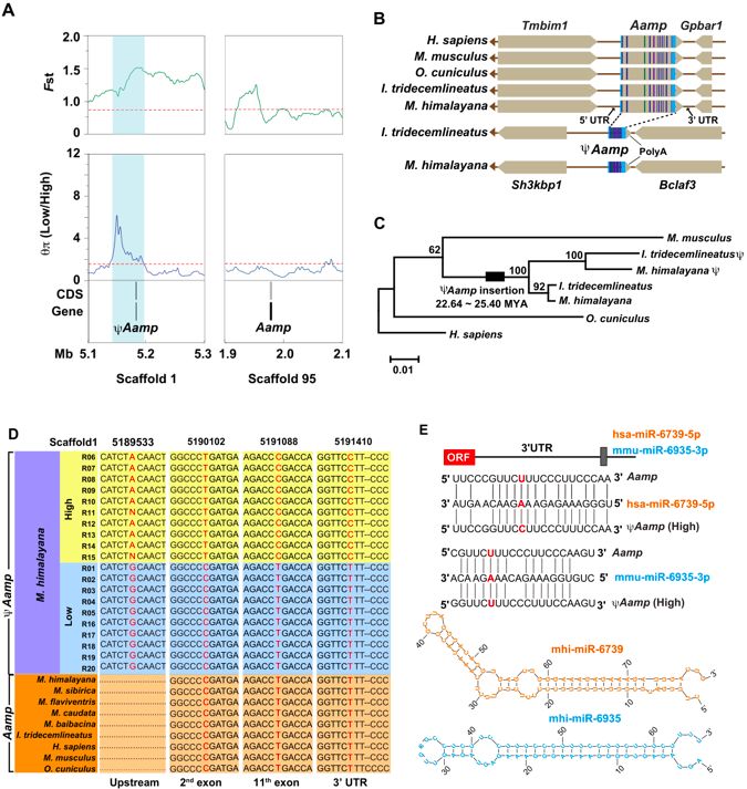 假基因逐漸被認(rèn)定為是適應(yīng)性表型多樣化的重要調(diào)節(jié)因子,與選擇性清除信號(hào)相關(guān),研究人員鑒定了27個(gè)參與極高海拔適應(yīng)的候選假基因,占全基因組范圍內(nèi)假基因的1.83%。這一比率幾乎與具有1.78%的功能基因的比率相當(dāng),表明它們?cè)跇O端環(huán)境的適應(yīng)性中的作用不可忽略。與蛋白質(zhì)編碼基因中發(fā)現(xiàn)的群體基因型差異一致,研究人員在高海拔群體中觀察到受選擇的假基因中幾乎固定的突變,例如ΨAamp,ΨAdl1和ΨRnf114。在這些假基因中,血管相關(guān)的遷移細(xì)胞蛋白假基因(ΨAamp)具有完整的基因結(jié)構(gòu)并顯示出*高的Fst值(Fst = 0.67),但ΨAamp未被檢測(cè)為受選擇性基因(圖4 A和5 A)。ΨAamp的結(jié)構(gòu)顯示它是一個(gè)整合的加工假基因,其mRNA通過(guò)逆轉(zhuǎn)錄被插入基因組中(圖5 B)。這個(gè)假基因含有過(guò)早終止密碼子(第208個(gè)核苷酸,C> T),缺失/插入和移碼突變,使其不能翻譯成功能性的蛋白,Aamp和ΨAamp的共線性分析表明在不同哺乳動(dòng)物中Aamp是高度保守的。然而,在地松鼠和喜馬拉雅旱獺中發(fā)現(xiàn)并保存了高度保守的共線性位點(diǎn)(圖5 B),進(jìn)一步的系統(tǒng)發(fā)育分析表明,ΨAamp和Aamp屬于兩個(gè)獨(dú)立的分支,基于序列分歧插入時(shí)間的估算暗示假基因的插入事件發(fā)生在約22.64~25.40 MYA,在喜馬拉雅旱獺和地松鼠分化之前(圖?5 C)。這些發(fā)現(xiàn)支持古老的假基因?qū)τ谒墒缶哂刑禺愋圆墓餐淖嫦冗z傳而來(lái)這一假設(shè),然而,與地松鼠相比,喜馬拉雅旱獺顯示Aamp和ΨAamp之間的序列距離較小,這表明存在選擇性壓力來(lái)維持旱獺的遺傳元素。