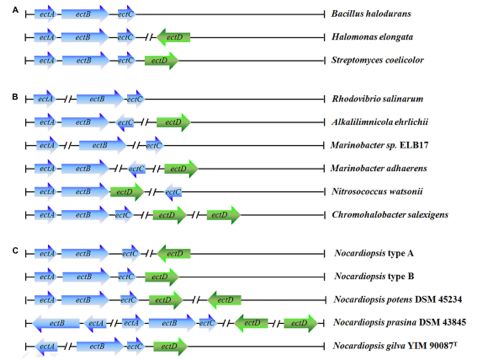 擬諾卡氏菌種是從鹽湖或堿性環(huán)境中分離出來的,其中有約三分之二的菌種嗜鹽或耐鹽。在高鹽環(huán)境下,擬諾卡氏菌可通過加固細胞壁和積累滲透因子等多種方式而使自身得以生存。鹽刺激條件下,滲透因子的累積可使得菌體在不影響其基本細胞進程和常規(guī)代謝的情況下而保持菌體滲透平衡。其中在自然界含量最多的滲透因子便是四氫嘧啶,其可促進蛋白折疊,并保護酶、核酸、抗體等生物分子,使細胞可應對多種壓力環(huán)境。在所有的擬諾卡氏菌種中都有參與四氫嘧啶合成的相關(guān)基因。
