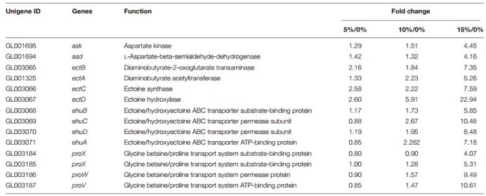 對菌種進行二代測序,篩選FDR<0.01,F(xiàn)old Change≥2的基因為差異表達基因,并使用COG、GO、KEGG、Swissport和NR數(shù)據(jù)庫進行注釋分析。通過COG分類,共獲得25個COG組別,其中氨基酸轉(zhuǎn)運和代謝、碳水化合物轉(zhuǎn)運和代謝是其主要組分。DEGs被分布在34個GO term里,其中包括細胞組分、分子功能和生物過程三大類。與此同時,三個比較組(5%/0%, 10%/0%和15%/0%)差異表達基因分別富集到77、32和90條KEGG通路中,其中ABC轉(zhuǎn)運受體,甘氨酸、絲氨酸和蘇氨酸代謝在鹽刺激下扮演相當重要的角色。尤其在最大耐受度的NaCl鹽環(huán)境里,參與ABC轉(zhuǎn)運受體通路的四氫嘧啶和羥基四氫嘧啶基因、甜菜堿基因和四氫嘧啶和羥基四氫嘧啶合成基因表達量都顯著提高。