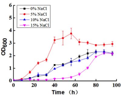 1、使用不同鹽濃度(0~15%)處理,觀察N.gilva?YIM 90087T的形態(tài)學變化、增殖、四氫嘧啶及羥基四氫嘧啶檢測,進行表型測定