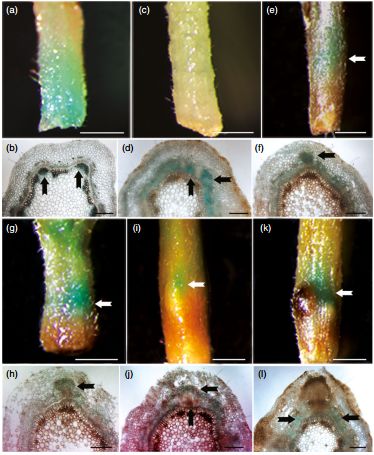 GUS信號在剪切后的0h主要在莖形成層和未成熟的木質(zhì)部存在,隨后在不定根誘導(dǎo)的2天后,越來越多的GUS信號聚集在形成層和次生韌皮部,3~4天,形成層、次生韌皮部和皮層的不定根原基細胞中出現(xiàn)GUS信號。在不定根誘導(dǎo)5天后,GUS信號在不斷增大的根原基逐漸降低并在第六天消失。結(jié)果表明,PagFBL1會參與不定根生成的初期階段,如誘導(dǎo)和萌生期,可參與生長素信號通路從而調(diào)控不定根的誘導(dǎo)和萌生。